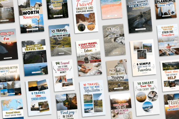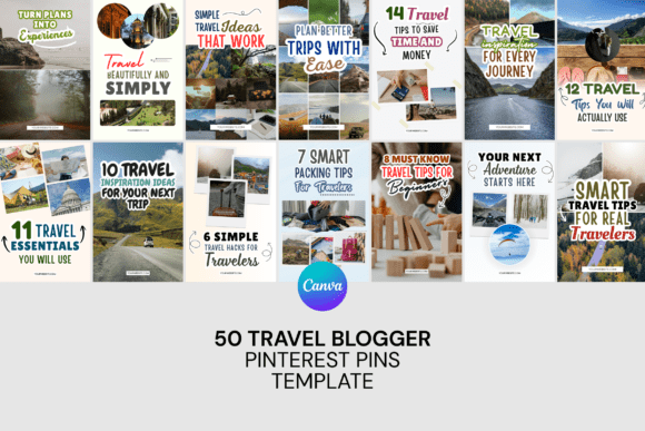 Inside you’ll find 50 layouts built for real travel content: city breaks, weekend trips, bucket‑list adventures, road trips, and those “save this for later” checklists. Fonts are easy to read, compositions already work for vertical pins, and with a few tweaks you can turn them into travel Pinterest pin templates, adventure Pinterest templates, or Pinterest pins for travel blogs that actually match your own travel style.