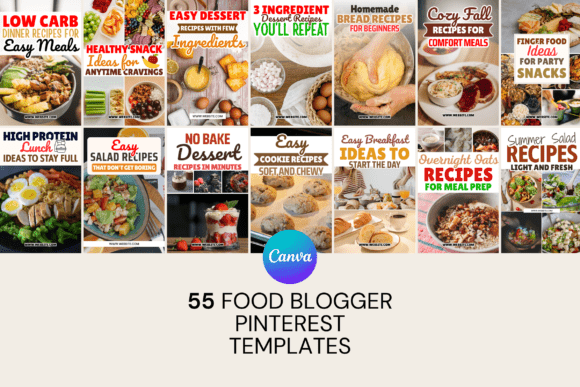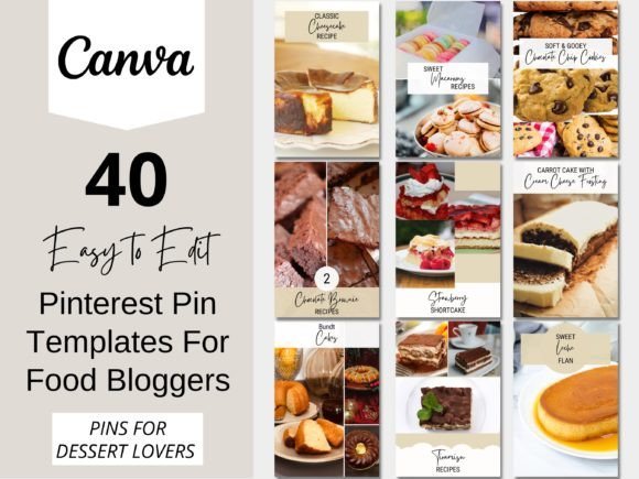 Edit the templates in a free Canva account, change fonts and colors, drop in your own food photography, and turn them into Pinterest templates for food bloggers, dessert Pinterest templates, food Pinterest pin templates, or Canva Pinterest templates for recipes that you reuse every time you post a new sweet treat.