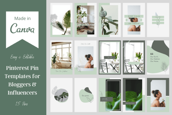 You get 15 layouts ready to go — swap the headline, drop in your photo, and you’re done. Works great for wellness, nature, sustainability, or any niche where that earthy green palette fits your vibe. Edit fonts, colors, and images in minutes, and build up green Pinterest templates, nature Pinterest pin templates, Pinterest templates for bloggers, and Pinterest templates for online business that actually look like your brand, not a random starter pack.