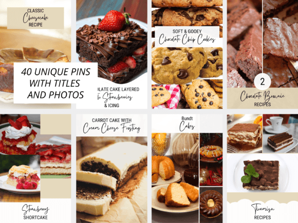 Inside you’ll find 40 ready pins with different headline styles and photo placements that work for single recipes, step‑by‑steps, seasonal specials, or “best of” collections. You can keep the prompts as writing inspiration or swap everything out and still keep that clean, unified dessert aesthetic your audience recognizes.